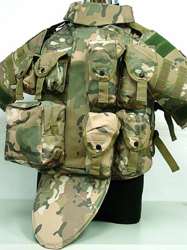 FEATURES: Made by high density nylon material. Soft cushion pads inside the front and back panel of the vest. Detachable cushion padded sleeves. Fully adjustable waist girth. 6 rows of 1" molle webbing cross straps on front and back for attaching pouches. 4 rows of 1" molle webbing cross straps on sleeves for attaching pouches. Velcro patch can be attached on shoulder. Cushion protection for neck, torso and upper arms. Lower body guard cover provide extra protection. Velcro strap front open. Including all pouches and accessory holders shown in photos. 4 detachable magazine pouches. 2 detachable grenade pouches. 1 detachable utility/medic pouch. Perfect for paintball, war game and other outdoor activities. DETAILS: Color - Multi camo Weight - 1950g