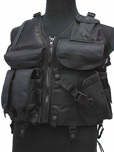 FEATURES: Made by high density nylon material. Zipper front open. Adjustable waist and chest girth. Including all pouches and accessory holders shown in photos. Interchangeable triple magazine pouches and airsoft gun case for your custom need. 2 triple magazine (detachable) and 2 utility pouches on the front. 1 walkie talkie or radio pouch. Universal airsoft gun case with magazine pouch (detachable), suitable for most frame size. 2 velcro flip compartments inside the vest front. Waist belt can be added. Cushion pad on right shoulder. Perfect for paintball, war game and other outdoor activities. DETAILS: Color - Matte black Weight - 1030g