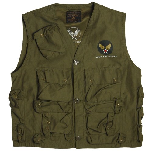 Slim fit made of thin cotton Inspired by the original survival vests worn by the Army Air Force Modified pocket design different from original vests (no pistol holster pocket) 10 front pockets 7 pockets in the rib/kidney areas
