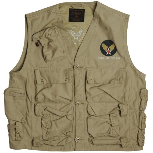 Slim fit made of thin cotton Inspired by the original survival vests worn by the Army Air Force Modified pocket design different from original vests (no pistol holster pocket) 10 front pockets 7 pockets in the rib/kidney areas