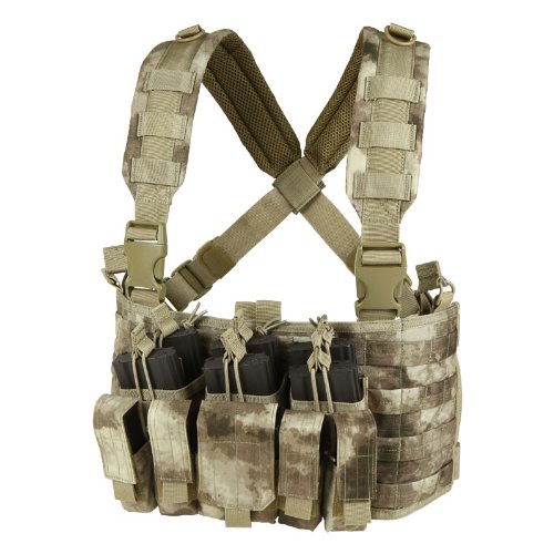 - Genuine A-TACS material, sewn in foreign country. -chest rig comes with three BUILT IN stackerKangaroo type mag pouch, will hold six M4 mag and six pistol mag. -Swivel Lockster - Swivel Push-Button release buckle. -Padded cross-back shoulder strap with webbing and D-ring. -Additional mesh pocket on the back. -Two open-top mag pouch. (one on each side) - One size fits most